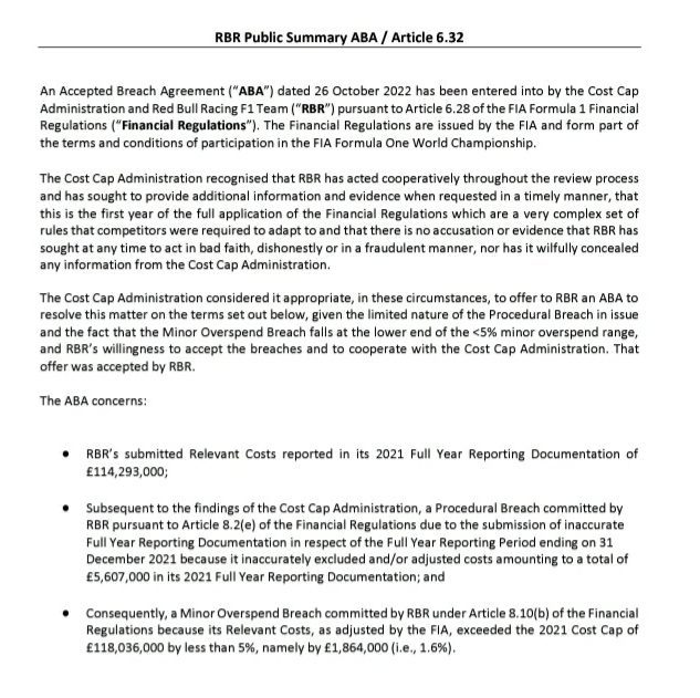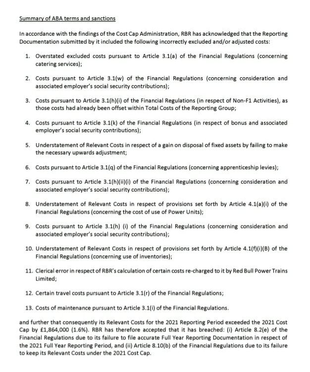 “The Cost Cap Administration recognised that Red Bull Racing has acted cooperatively throughout the review process and has sought to provide additional information and evidence when requested in a timely manner, that this is the first year of the full application of the Financial Regulations and that there is no accusation or evidence that RBR (Red Bull Racing) has sought at any time to act in bad faith, dishonestly or in fraudulent manner, nor has it wilfully concealed any information from the Cost Cap Administration,”