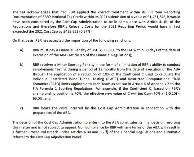 “In these circumstances, the Cost Cap Administration offered to RBR an ABA to resolve this matter. That offer was accepted by RBR.”