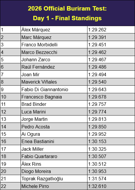 At 6:00pm local time, and with the sun setting on Buriram, the first day of testing is done. It’s fairly close across the board, with the top 15 all within the 1:29’s. Álex Márquez clinches the top spot on day one, and all eyes now turn to tomorrow for the final day of pre-season testing.
