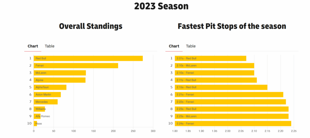 Red Bull has been the winning the fastest pitstop title for the last five years. In the current season, McLaren secures the third position, with Red Bull continuing to lead the table with 274 points, closely followed by Ferrari with 212 points.