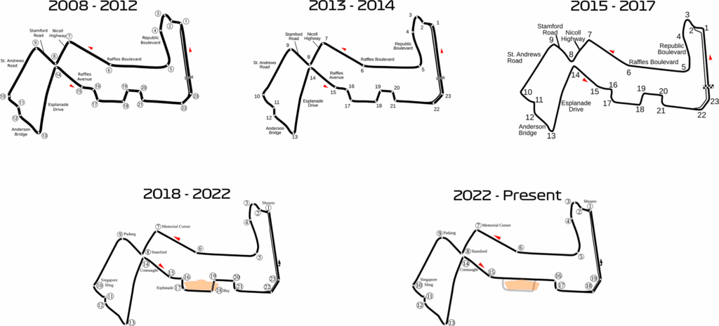 The “Singapore Sling” at Turn 10 previously had high kerbs, leading to fears that cars could become airborne. The kerbs were lowered multiple times over the course of the 2008 race weekend. The following year, they were repositioned to allow for a more gradual entry. Unfortunately, the changes saw the corner being dubbed “the worst corner in Formula 1”, and the chicane was scrapped altogether for the 2013 Grand Prix. A single-apex left-hand bend replaced the chicane.
