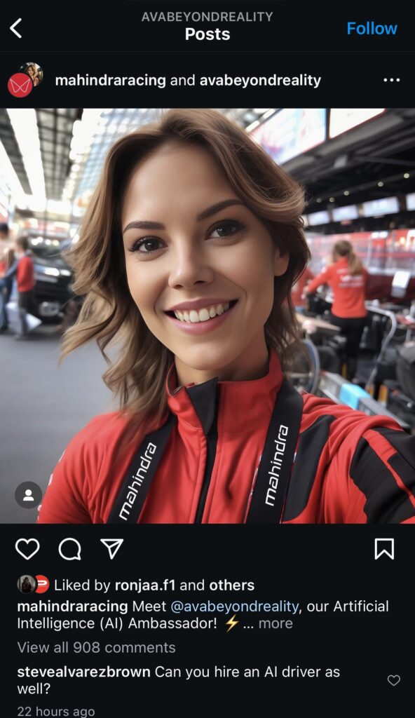 Mahindra Racing, an Indian-owned Formula E team, ventured into uncharted territory by introducing Ava—a virtual influencer designed to engage fans, document the team’s journey, and champion sustainability on Instagram (@avabeyondreality).