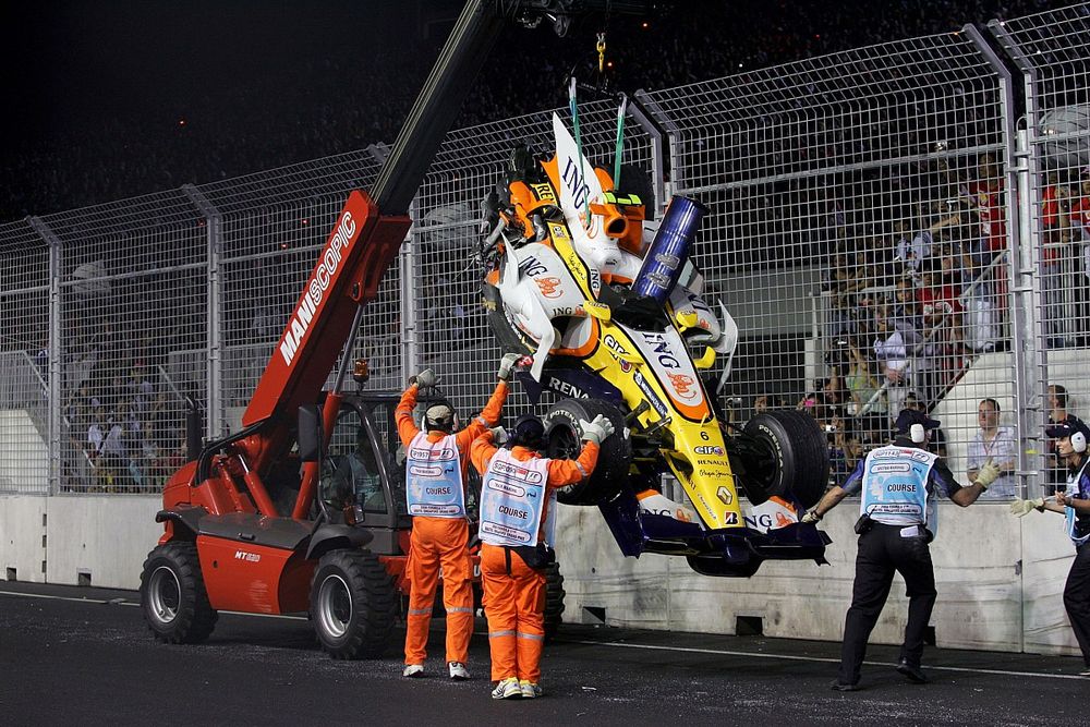 The team involved in crashgate was Renault F1. Nelson Piquet Jr had seemingly deliberately crashed during the 2008 Marina Bay GP to give teammate Fernando Alonso an advantage. Piquet Jr had crashed into the wall crucially near the time many drivers would need to pit and refuel. Alonso had already pitted, promoting him to the front of the pack after a safety car (SC.)