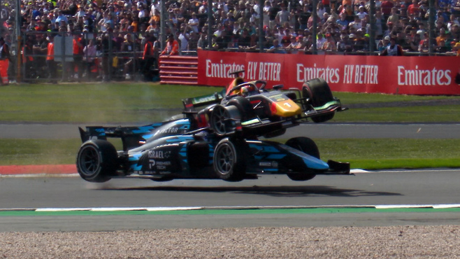 Hauger’s car struck Nissany’s around the cockpit area, the Halo taking the full brunt of the impact which resulted in both cars being lifted into the air and landing in the gravel. Both drivers were able to get out of their cars unaided but clearly shaken up by the incident.